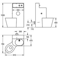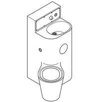 Conjunto sanitario "lavabo + inodoro" fabricado en acero inoxidable, superficie pulida mate, para montaje en pared. Fijación oculta con tornillos bilaterales, abertura de inspección con cerradura. Columna apoyada en el suelo, espesor de material 2 mm, pared trasera elevada con salida de agua integrada y botón de activación. Lavabo ovalado perfectamente unido a la columna, sifón de plástico. Hueco soldado sin costuras para guardar papel higiénico. Taza con embudo de acero inoxidable soldada, espesor de material 1,6 mm, con faldón envolvente hasta el suelo, colocación de la taza en el lado izquierdo en un ángulo de 45°. El borde de la cuba está protegido contra objetos ocultos, rendimiento de descarga certificado según EN 997, desagüe trasero horizontal DN 100. Válvula de globo de cierre automático con accionamiento remoto para conectar agua premezclada o fría, cierre automático con protección antirrebote . Depósito de agua oculto con aislamiento anticondensación, capacidad de descarga constante (9 o 6 l). Kit de montaje incluido.