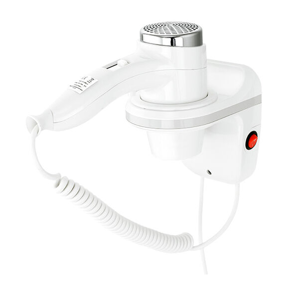 Hotelový fén Sanitario s horizontálnou rukoväťou má kompaktné rozmery, vďaka čomu je vhodný aj do menších priestorov. Biele zariadenie sa hodí do dizajnu väčšiny kúpeľní a dodáva im eleganciu.