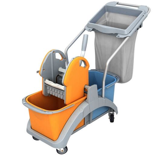Wózek porządkowy z kolekcji AquaSplast marki Splast wykonany ze wzmocnionego tworzywa sztucznego wysokiej jakości z bardzo wytrzymałą podstawą. Wózek wyposażony jest w dwa pojemne wiadra o pojemności 20 litrów oraz prasę wyciskającą do mopów płaskich z wygodną gumowaną rękojeścią, uchwytem ułatwiającym przemieszczanie się oraz z obejmą na worek na śmieci (jeden worek dołączony do wózka w zestawie na start). Całość wózka jest lekka i łatwa w obsłudze. Konstrukcja dwuwaderkowego wózka porządkowego umieszczona na gumowanych kółkach samoskrętnych, które poruszają się cicho, dbając o podłogę. Ten godny polecenia wózek do sprzątania sprawdzi się w wielu obiektach.