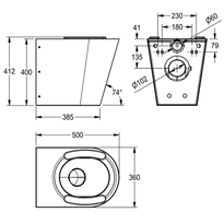 Závesná záchodová misa s krytom na podlahu. Nerezová oceľ, matne brúsený povrch. Hrúbka materiálu 1,6 mm. Metóda splachovania certifikovaná podľa EN 997. Neviditeľná splachovacia hrana. Prispôsobené na splachovacie nádrže s kapacitou min. 4 l Horizontálny zadný výpust s krytým sifónom, priemer 100 mm. Sedák je zo všetkých strán zaoblený, s prelisom padajúcim smerom k otvoru. Sada obsahuje montážnu dosku v súlade s EN 38 a upevňovacie skrutky proti krádeži.