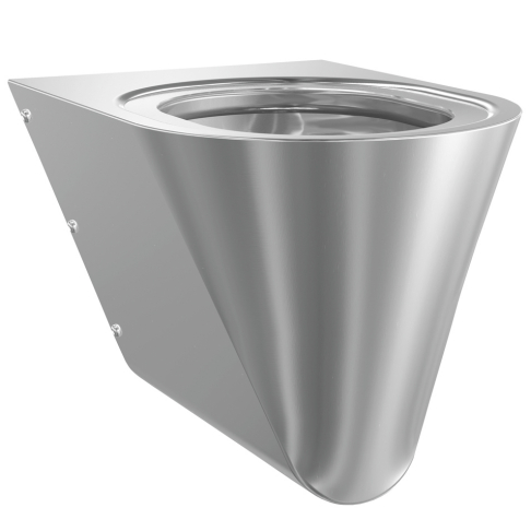 Inodoro suspendido. Acero inoxidable, superficie rectificada mate. Grosor del material 1,6 mm. Método de lavado certificado según EN 997. Borde de lavado invisible. Adaptado a cisternas con capacidad mín. Desagüe trasero horizontal de 4 l con sifón tapado, diámetro 100 mm. El asiento es redondeado por todos lados y tiene un relieve que cae hacia la abertura. El juego incluye una placa de montaje que cumple con EN 38 y tornillos de montaje antirrobo.