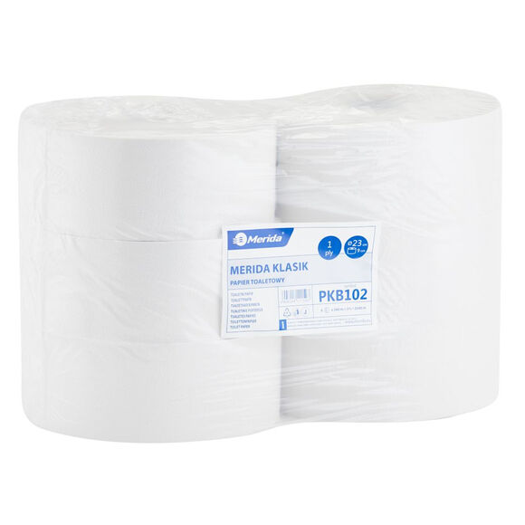 Papel higiénico Mérida en rollo jumbo de 23 cm de diámetro destinado a baños públicos de tránsito medio y pesado.