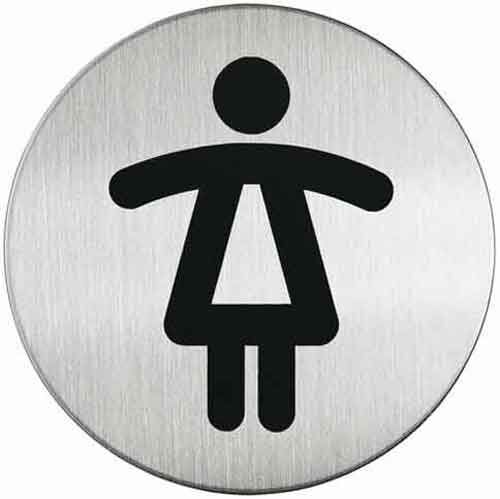 Marking for the women's toilet door. Made of brushed stainless steel, legible and durable, with the image of a woman. Elegant and modern signage, perfect for toilet doors in public facilities, restaurants, clubs or hotels. A special self-adhesive layer allows easy installation.