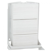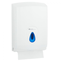 Plastic ZZ paper towel dispenser in white with a blue control window informing about the amount of refill. The Merida dispenser is designed for refills with a capacity of 500 towels.