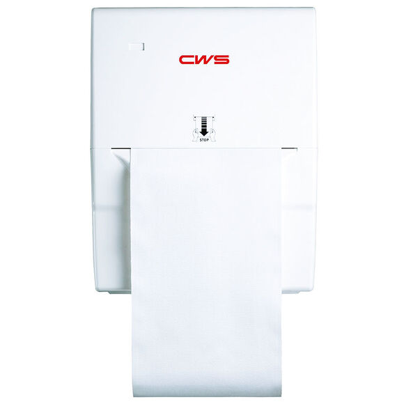 Zásobník na bavlněné ručníky CWS Heavy Duty funguje tak, že si uživatel otře ruce do čisté prodloužené části ručníku a další část je k dispozici po zatažení za tkanina s jeho rukou. Znečištěná část se automaticky uloží do samostatné přihrádky.