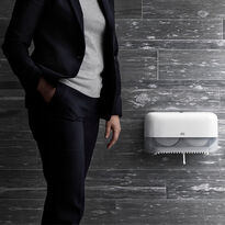 Bílý zásobník na toaletní papír od Tork, ideální řešení pro koupelny se středním a silným provozem, umožňuje díky použití rolí bez kartonového jádra výrazně snížit množství odpadu produkovaného při provozu toalety a usnadnit proces doplňování spotřebního materiálu. Elegantní plastový kryt tohoto malého a esteticky provedeného zásobníku toaletního papíru lze díky kompaktním rozměrům snadno namontovat na stěnu i malých koupelen, aniž by zabíral příliš mnoho místa. Díky možnosti umístit dovnitř až dvě role MID-SIZE, o něco větší než standardní, je zařízení Tork extrémně efektivní a pojme až devětkrát více papíru než standardní kontejnery jiných společností. Dodatečné vybavení, jako je zoubkovaný okraj, který usnadňuje dávkování listů a zámek otevíraný plastovým klíčem, činí z produktu řady Elevation skvělý prvek interiérového designu na toalety v kancelářích a restauracích.