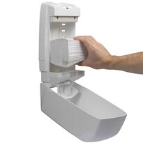 Praktyczny podajnik niezbędny w każdej toalecie. Uzupełniany papierem toaletowym w składce, podajnik zapewnia szybkie i łatwe dozowanie pojedynczych listków papieru.