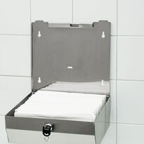 Metalowy pojemnik przeznaczony na ręczniki papierowe. Wykonany ze stali nierdzewnej dobrej jakości. Wytrzymały i odporny na uszkodzenia mechaniczne. Okienko kontrolne na froncie obudowy informuje o poziomie ręczników. Wyciągnięcie jednej sztuki papieru powoduje automatyczne wysunięcie się kolejnej. Zabezpieczony zamkiem zamykanym na klucz.