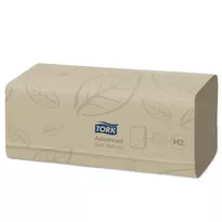 Ręczniki Tork H2 są wykonane z dwóch warstw, co zapewnia ich wysoką chłonność i wytrzymałość. Dzięki dużym wymiarom przed złożeniem i atrakcyjnemu wzorowi listka, produkt wywiera pozytywne wrażenie na użytkownikach, podnosząc standard każdej łazienki. Dozowanie po jednym odcinku zmniejsza zużycie, co przyczynia się do mniejszej ilości odpadów oraz poprawia poziom higieny, gdyż użytkownicy dotykają tylko ręcznika, którego używają.