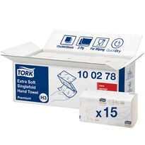 La toalla plegada ZZ Tork Premium está hecha de dos capas de celulosa utilizando tecnología TAD. Las capas se unen con una mínima cantidad de pegamento incorporado a la estructura de la toalla. La toalla es absorbente y muy duradera incluso cuando está mojada. Una hoja es suficiente para secarte las manos. La toalla plegada Tork Premium se recomienda para baños con tránsito intenso y medio.
