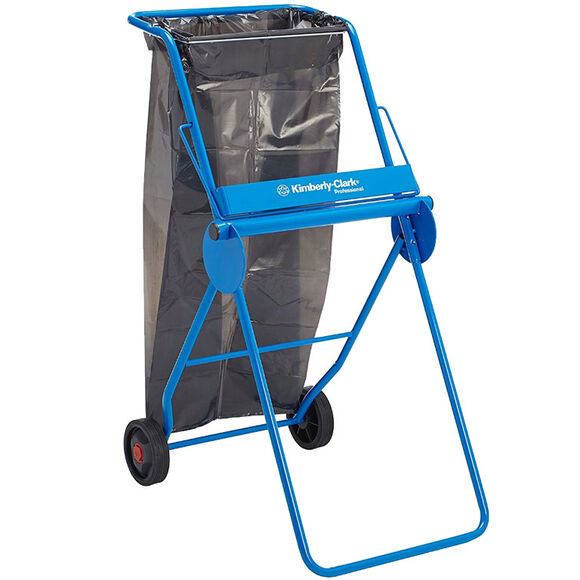 Soporte de limpieza de rollos de acero Kimberly Clark en azul. Un dispensador de paños de limpieza de pie es perfecto para dispensar paños de limpieza grandes en rollo. El soporte tiene ruedas traseras, por lo que se puede mover fácilmente. Será útil en plantas grandes donde pueda ser necesario en varios lugares remotos. El soporte para bolsas le permite colgar una bolsa de basura grande, lo que le ahorra tiempo al tirar la basura al bote de basura.