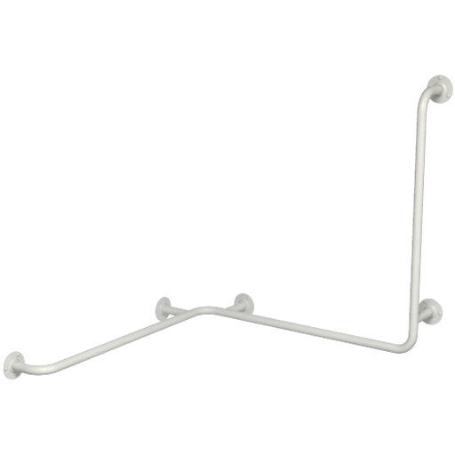 Angle handrail designed for a disabled toilet, mounted to the wall. Five support points ensure stability and safety. The angle holder is designed to be mounted on the wall in the shower or bathtub. A handrail made of white powder-coated carbon steel, suitable for use in bathrooms and toilets for disabled people. The set includes a handle, screws and wall plugs.