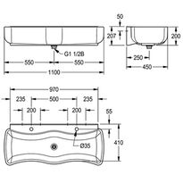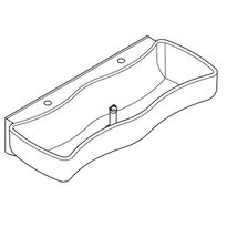 Umywalka ze związanego żywicą kompozytu mineralnego MIRANIT. Kolor biały. Dwa stanowiska do mycia i zabawy. Komora o falistym kształcie i dużych przekątnych zewnętrznych i wewnętrznych. Półka z otworem na armaturę dla każdego stanowiska. Zawór odpływowy i przelewowy w postaci przelewu rurkowego. Montaż do odpowiednio ukształtowanej ściany tylnej umywalki. W komplecie: zestaw montażowy.
