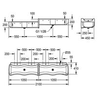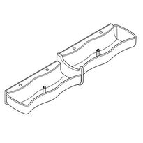Dětský umyvadlový žlab z kompozitního minerálního materiálu MIRANIT. Barva bílá. Čtyři pracoviště pro mytí a hraní (dvě pracoviště oddělena prahem o výšce 100 mm). Komora s vlnitým tvarem a velkými vnějšími a vnitřními úhlopříčkami. Polička s otvorem pro armaturu pro každé pracoviště. Integrovaná oddělovací stěna s přepadovou funkcí z MIRANITU, modrá barva (RAL 5002). Odpadní a přepadový ventil ve formě přepadové trubky pro každé 2 pracoviště. Montáž na odpovídající zadní stěnu umyvadla. Součástí balení: montážní sada.