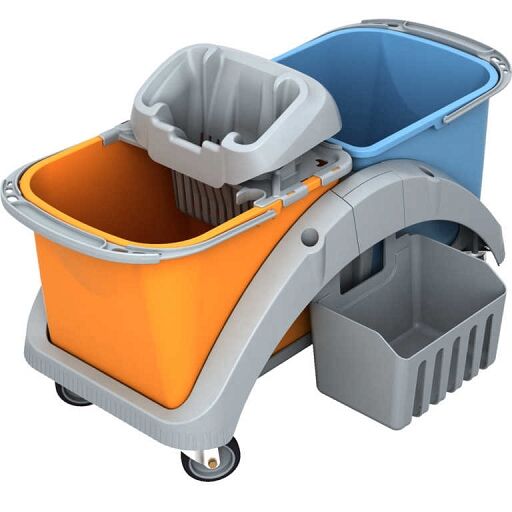 A tidying trolley from the AquaSplast collection by Splast made of high-quality reinforced plastic with a very durable base. The trolley is equipped with two spacious buckets with a capacity of 20 liters, a mop wringer made of durable plastic and a side basket where you can put detergents. The whole thing is light and easy to use. The structure of the cleaning trolley is placed on rubberized self-swivel wheels that move silently, taking care of the floor. This highly recommended cleaning trolley will work well in many facilities.