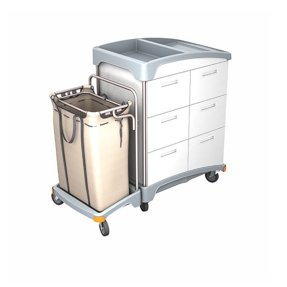 Hotelový vozík pro udržování čistoty v ubytovacích zařízeních je vyroben z vys. -kvalitní materiál plast, nerez a textilie. Hotelová sestava se šesti zásuvkami a košem na prádlo. Horní deska stolu má zábradlí, které zabraňuje sklouznutí předmětů během přepravy. Pohodlná, estetická a pevná hotelová sada pro čištění a přepravu prádla.