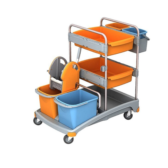 Hotelový úklidový vozík vybavený 2 20litrovými kbelíky s lisem na mop, 2 6litrovými kbelíky a 2 odpadkovými boxy. Za pozornost stojí velmi kvalitní materiály, ze kterých je kočárek vyroben. Sada pro mokré čištění je ideální pro velká zařízení a je zvláště doporučena pro profesionální úklidové týmy.