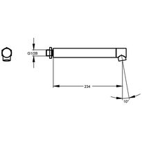 Caño de pared equipado con un aireador a prueba de robo. El caño tiene un alcance de 234 mm y un ángulo de inclinación fijo de 10°. El cuerpo de latón pulido tiene un revestimiento de cromo. El caño pertenece a la grifería de lavabo recomendada para baños públicos.