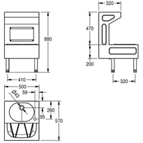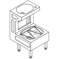 Nutzfach mit Waschbecken, stehend oder an der Wand montiert. Edelstahl, mattpolierte Oberflächen, Materialstärke 1,2 mm. Nahtlos verschweißter Waschtisch mit den Maßen 360 x 272 x 135 mm, ohne Überlauf. Mit einem 1 1/4˝-Flachsieb abtropfen lassen. Auf der rechten Seite befindet sich ein Batterieloch. Kammerbecken mit den Maßen 420 x 350 x 180 mm, umgeben von einem profilierten Rand. Konvexer Ablauf 1 1/2", zentriert. Hochklappbarer Edelstahlrost mit Gummistoßmanschetten. Abnehmbare Schauglasabdeckung. Höhenverstellbare Beine.