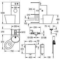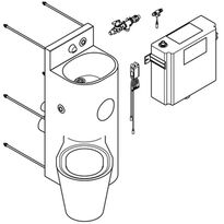 Sanitárna zostava "umývadlo + WC misa" z nehrdzavejúcej ocele, matný leštený povrch, pre montáž chrbtom k stene za ktorou sa nachádza obslužná miestnosť s diaľkovým elektronickým príslušenstvom namontovaným v obslužnej miestnosti. Závitové tyče pre inštaláciu zabezpečenú proti vandalizmu na strane servisnej miestnosti. Stĺpik stojaci na podlahe, hrúbka materiálu 2 mm, zvýšená zadná stena s integrovaným výtokom vody a piezoelektrickým tlačidlom s funkciou Start/Stop. Umývadlová misa oválneho tvaru plynule napojená na stĺp, plastový sifón, výpust DN 40 Bezproblémovo zvarená priehlbina na odkladanie toaletného papiera. Zváraná nerezová lieviková toaletná misa, hrúbka materiálu 1,6 mm, s obvodovou zásterkou po zem, umiestnenie WC misy na ľavej strane pod uhlom 45°. Okraj misy chránený proti ukrytiu predmetov, aktivácia splachovania piezoelektrickým tlačidlom, splachovací výkon certifikovaný podľa EN 997, horizontálny zadný odtok DN 100. Solenoidový ventil na pripojenie na predmiešanú vodu alebo prírodnú vodu. Podomietkový zásobník na vodu s antikondenzačnou izoláciou, stála kapacita splachovania (9 alebo 6 l). Pripájacie napätie 24 V DC. Vrátane montážnej súpravy.