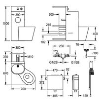 Sanitary set "washbasin + toilet bowl" made of stainless steel, matt polished surface, for installation with the back to the wall behind which it is located service room, with remote electronic fittings mounted in the service room. Threaded rods for vandal-proof installation on the service room side. Column standing on the floor, material thickness 2 mm, raised rear wall with integrated water spout and piezoelectric button with Start/Stop function. Oval washbasin bowl seamlessly connected to the column, plastic siphon, DN 40 drain. Seamlessly welded recess for storing toilet paper. Welded stainless steel funnel toilet bowl, material thickness 1.6 mm, with floor-length surrounding apron, positioning of the toilet bowl on the right at an angle of 45°. Bowl edge protected against objects being hidden, flush activation via piezoelectric button, flushing performance certified according to EN 997, horizontal rear drain DN 100. Solenoid valve for connection to pre-mixed water or natural water. Concealed water tank with anti-condensation insulation, constant flushing capacity (9 or 6 l). Connection voltage 24 V DC. Mounting kit included.
