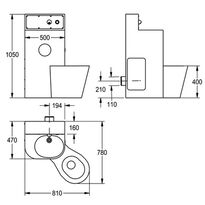 Sanitární sada "umyvadlo + záchodová mísa" z nerezové oceli, matně leštěný povrch, pro montáž na stěnu. Skryté upevnění pomocí oboustranných šroubů, uzamykatelný revizní otvor. Sloup stojící na podlaze, tloušťka materiálu 2 mm, zvýšená zadní stěna s integrovaným chrličem vody a aktivačním tlačítkem. Oválná umyvadlová mísa plynule napojená na sloup, plastový sifon. Bezproblémově svařované vybrání pro uložení toaletního papíru. Svařovaná nerezová trychtýřová toaletní mísa, tloušťka materiálu 1,6 mm, s obvodovou zástěrou v délce podlahy, záchodová mísa umístěna na pravé straně pod úhlem 45°. Okraj mísy chráněn proti ukrytí předmětů, splachovací výkon certifikován dle EN 997, horizontální zadní výpusť DN 100. Samouzavírací kulový ventil s dálkovým ovládáním pro připojení předmíchané nebo studené vody, samouzavírací s ochranou proti odskoku . Podomítková nádrž na vodu s antikondenzační izolací, konstantní splachovací kapacita (9 nebo 6 l). Včetně montážní sady.