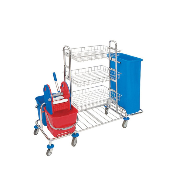 A cleaning trolley intended primarily for professional cleaning companies. The chrome-plated, stable structure of the cleaning trolley is placed on rubber wheels that work quietly and do not damage floors. The cleaning set is equipped with four buckets of different colors to facilitate water segregation, a jaw press that thoroughly squeezes water and dirt from the mop fibers, baskets for detergents and cleaning accessories, and a replaceable garbage bag with a capacity of 120 liters. The whole is made of high-quality materials, durable, durable and easy to use.