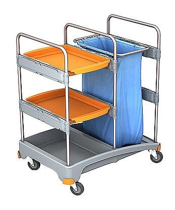 Wózek hotelowy do sprzątania TSZ0013 wyposażony został w półkę, dwie wysuwane szuflady oraz 120 l. worek na odpady, co pozwala na kompleksową obsługę dużych i średnich obiektów. Wykonano go z solidnego tworzywa sztucznego i stali szlachetnej. Profesjonalny zestaw sprzątający dzięki solidnej i przemyślanej konstrukcji zapewnia komfort pracy. Zestaw do sprzątania doskonale sprawdzi się w takich miejscach jak hotele, kina, centra handlowe, ośrodki zdrowia i sportu, szkoły i inne.