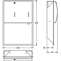 - Abmessungen: - Höhe: 632 mm, - Breite: 424 mm, - Tiefe: 147 mm