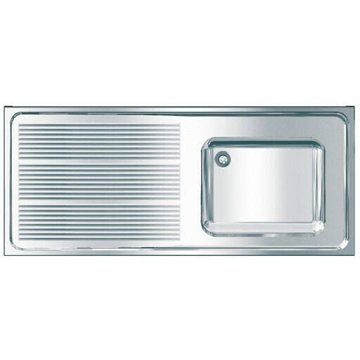 Průmyslový dřez pro montáž na desku nebo na stěnu. Nerezová ocel, matně broušené povrchy, tloušťka materiálu 1 mm. Počet komor: 1. Poloha odkapávače: vlevo.